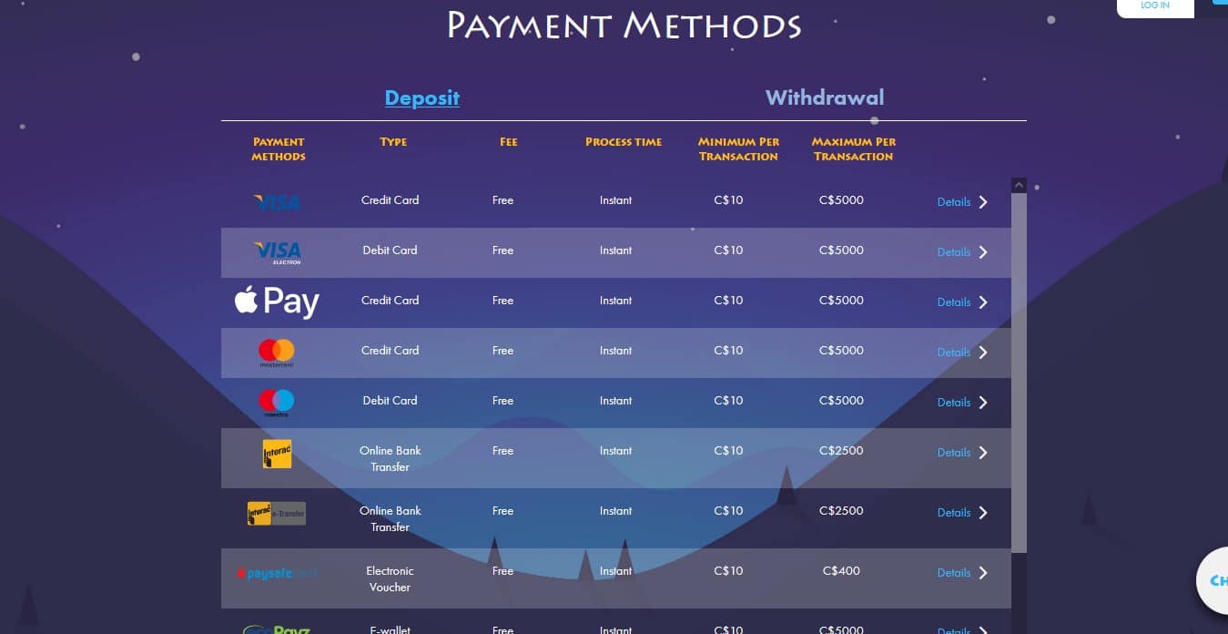 Les méthodes de paiement et de retrait suivantes sont proposées par le casino.