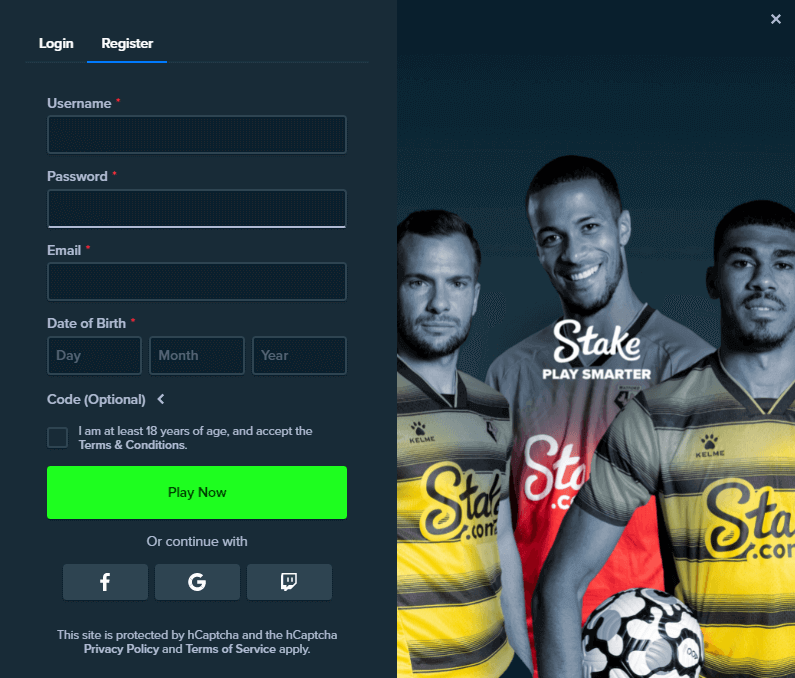Pour commencer à parier sur Stake, les joueurs doivent s'inscrire sur la plateforme soit en se connectant via leurs plateformes de médias sociaux comme Twitch, Facebook et Google, soit en suivant le processus traditionnel en remplissant le formulaire et en vérifiant leurs identités.